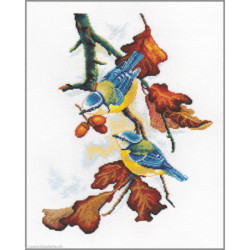 Oven, kit Blue Tits (art. OV910). Dimensions: 26 x 33 cm. Trame: Aïda 6.4 pts. Trame blanche.