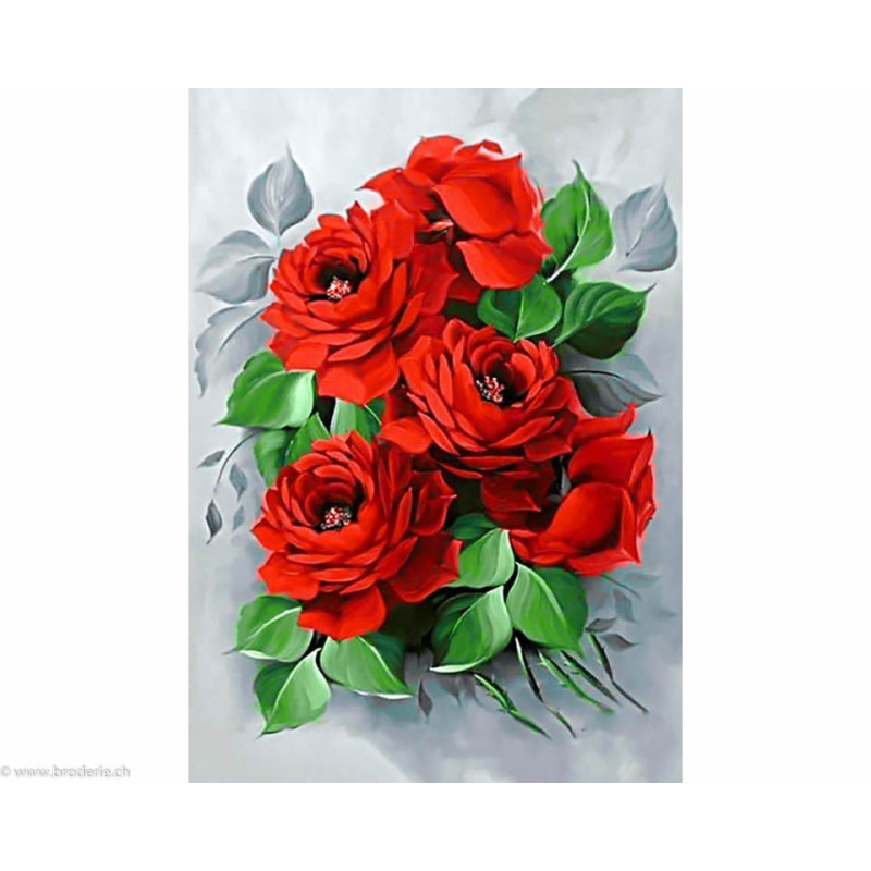 Collection d'Art, kit diamant Elegant roses (art. CADE309). Dimensions: 27 x 38 cm. Kit comprenant la toile adhésive, les strass carrés emballés dans des sachets individuels et numérotés aux références des coloris de DMC, une pince, un stylo et sa colle, 2 réceptables et les explications.Toute la surface du tableau est à recouvrir de strass. ATTENTION: ce n'est pas une broderie, il n'y a ni fil ni aiguille, mais un collage comme une mosaïque.