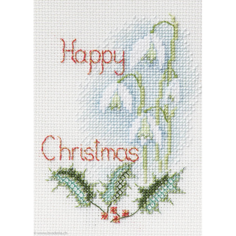 Derwentwater, kit Christmas Card - Snowdrops (art. DWCDX51). Dimensions: 9 x 13 cm. Trame: Aïda 6.4 pts. Points utilisés: point de croix. Kit carte de voeux, contient la carte et, l'enveloppe. Dans la même série DWCDX, pour les autres cartes de voeux, réf sous DWCDG et numéro.