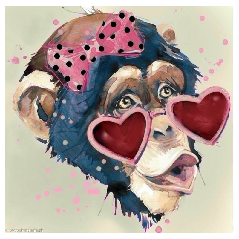 Collection d'Art, kit diamant Ms Monkey (art. CADE7007). Dimensions: 38 x 38 cm. Kit comprenant la toile adhésive, les strass carrés emballés dans des sachets individuels et numérotés aux références des coloris de DMC, une pince, un stylo et sa colle, 2 réceptables et les explications.Toute la surface du tableau est à recouvrir de strass. ATTENTION: ce n'est pas une broderie, il n'y a ni fil ni aiguille, mais un collage comme une mosaïque.