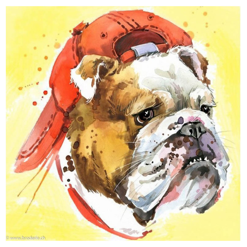 Collection d'Art, kit diamant Supercool Bulldog (art. CADE7008). Dimensions: 38 x 38 cm. Kit comprenant la toile adhésive, les strass carrés emballés dans des sachets individuels et numérotés aux références des coloris de DMC, une pince, un stylo et sa colle, 2 réceptables et les explications.Toute la surface du tableau est à recouvrir de strass. ATTENTION: ce n'est pas une broderie, il n'y a ni fil ni aiguille, mais un collage comme une mosaïque.