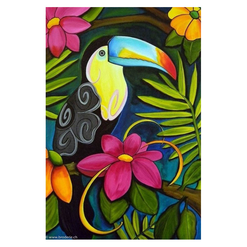 Collection d'Art, kit diamant Tropical toucan (art. CADE7059). Dimensions: 19 x 27 cm. Kit comprenant la toile adhésive, les strass carrés emballés dans des sachets individuels et numérotés aux références des coloris de DMC, une pince, un stylo et sa colle, 2 réceptables et les explications.Toute la surface du tableau est à recouvrir de strass. ATTENTION: ce n'est pas une broderie, il n'y a ni fil ni aiguille, mais un collage comme une mosaïque.