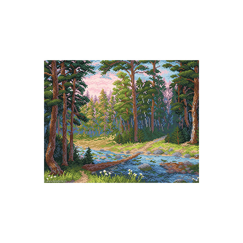 BrilliArt, kit diamant Forested river (art. MC-003). Dimensions: 48 x 38 cm. Kit comprenant la toile adhésive, les strass carrés emballés dans des sachets individuels et numérotés aux références des coloris de DMC, une pince, un stylo et sa colle, 2 réceptables et les explications.Toute la surface du tableau est à recouvrir de strass. ATTENTION: ce n'est pas une broderie, il n'y a ni fil ni aiguille, mais un collage comme une mosaïque.