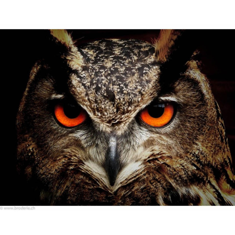 Collection d'Art, kit diamant Owl (art. CADE7071). Dimensions: 38 x 27 cm. Kit comprenant la toile adhésive, les strass carrés emballés dans des sachets individuels et numérotés aux références des coloris de DMC, une pince, un stylo et sa colle, 2 réceptables et les explications.Toute la surface du tableau est à recouvrir de strass. ATTENTION: ce n'est pas une broderie, il n'y a ni fil ni aiguille, mais un collage comme une mosaïque.