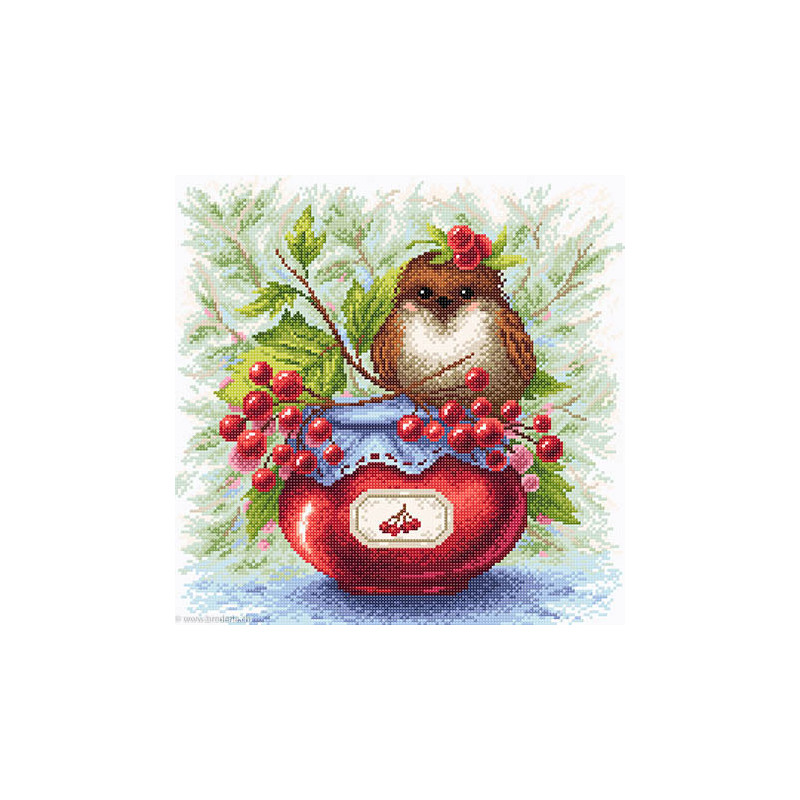 BrilliArt, kit diamant Viburnum Berries (art. MC-009). Dimensions: 38 x 38 cm. Kit comprenant la toile adhésive, les strass carrés emballés dans des sachets individuels et numérotés aux références des coloris de DMC, une pince, un stylo et sa colle, 2 réceptables et les explications.Toute la surface du tableau est à recouvrir de strass. ATTENTION: ce n'est pas une broderie, il n'y a ni fil ni aiguille, mais un collage comme une mosaïque.