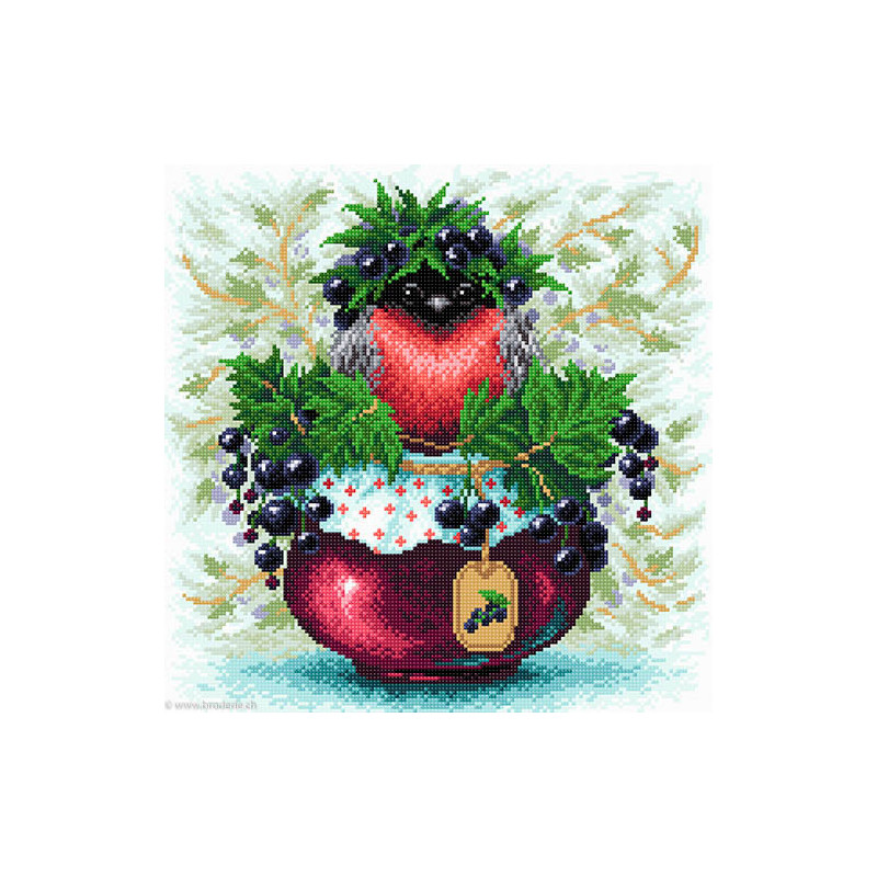 BrilliArt, kit diamant Currant berries (art. MC-017). Dimensions: 38 x 38 cm. Kit comprenant la toile adhésive, les strass carrés emballés dans des sachets individuels et numérotés aux références des coloris de DMC, une pince, un stylo et sa colle, 2 réceptables et les explications.Toute la surface du tableau est à recouvrir de strass. ATTENTION: ce n'est pas une broderie, il n'y a ni fil ni aiguille, mais un collage comme une mosaïque.