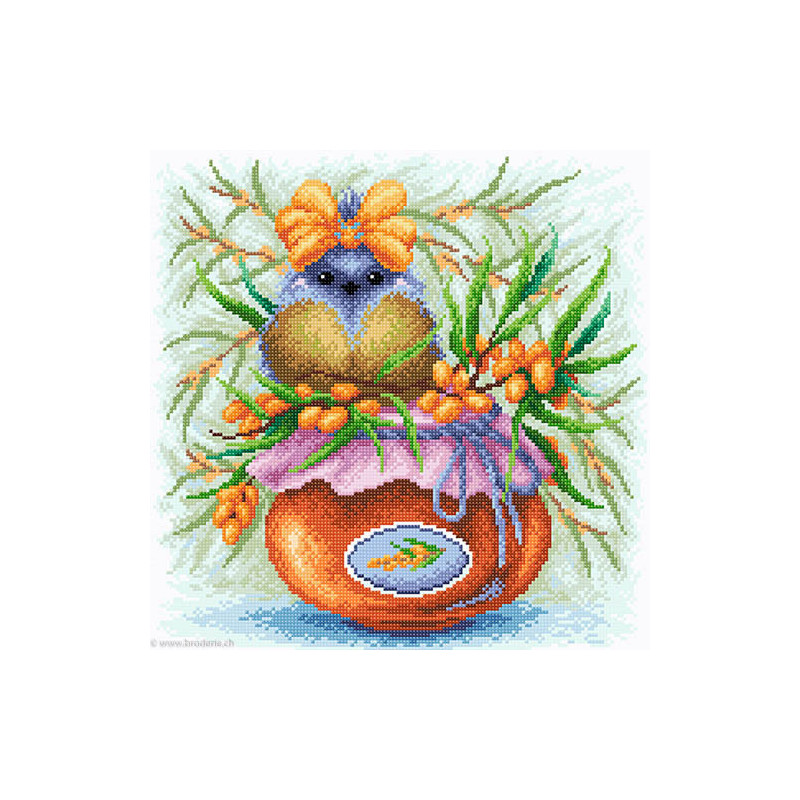 BrilliArt, kit diamant Sea buckthorn berries (art. MC-026). Dimensions: 38 x 38 cm. Kit comprenant la toile adhésive, les strass carrés emballés dans des sachets individuels et numérotés aux références des coloris de DMC, une pince, un stylo et sa colle, 2 réceptables et les explications.Toute la surface du tableau est à recouvrir de strass. ATTENTION: ce n'est pas une broderie, il n'y a ni fil ni aiguille, mais un collage comme une mosaïque.