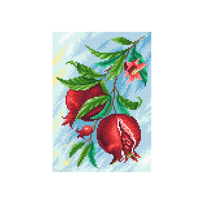 BrilliArt, kit diamant Pomegranate (art. MC-049). Dimensions: 19 x 27 cm. Kit comprenant la toile adhésive, les strass carrés emballés dans des sachets individuels et numérotés aux références des coloris de DMC, une pince, un stylo et sa colle, 2 réceptables et les explications.Toute la surface du tableau est à recouvrir de strass. ATTENTION: ce n'est pas une broderie, il n'y a ni fil ni aiguille, mais un collage comme une mosaïque.