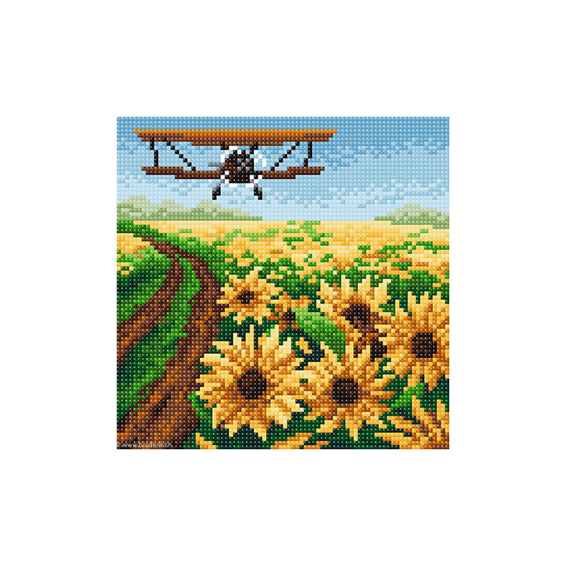 BrilliArt, kit diamant Sunflower sea (art. MC-050). Dimensions: 20 x 20 cm. Kit comprenant la toile adhésive, les strass carrés emballés dans des sachets individuels et numérotés aux références des coloris de DMC, une pince, un stylo et sa colle, 2 réceptables et les explications.Toute la surface du tableau est à recouvrir de strass. ATTENTION: ce n'est pas une broderie, il n'y a ni fil ni aiguille, mais un collage comme une mosaïque.