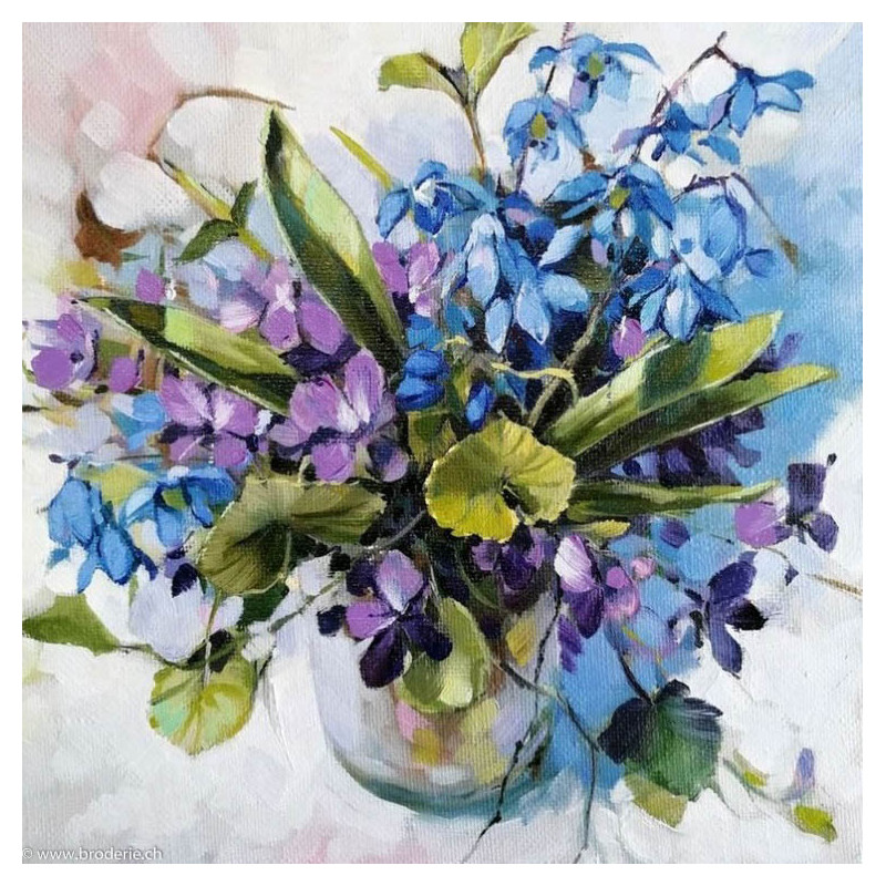 Collection d'Art, kit diamant Violets and snowdrops (art. CADE7126). Dimensions: 38 x 38 cm. Kit comprenant la toile adhésive, les strass carrés emballés dans des sachets individuels et numérotés aux références des coloris de DMC, une pince, un stylo et sa colle, 2 réceptables et les explications.Toute la surface du tableau est à recouvrir de strass. ATTENTION: ce n'est pas une broderie, il n'y a ni fil ni aiguille, mais un collage comme une mosaïque.