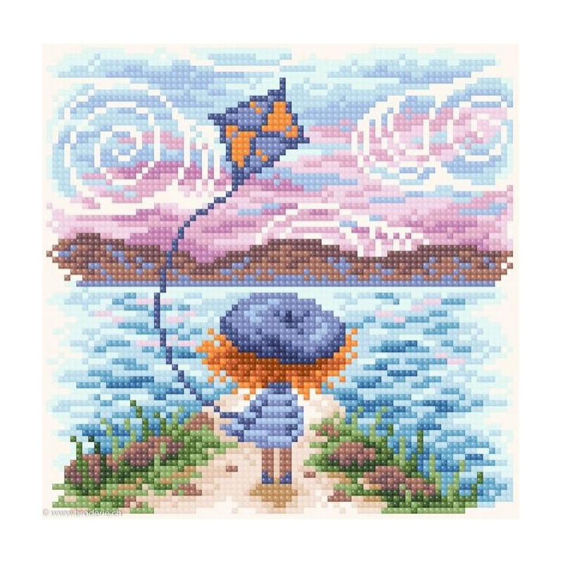 BrilliArt, kit diamant Dreams about the sea (art. MC-076). Dimensions: 20 x 20 cm. Kit comprenant la toile adhésive, les strass carrés emballés dans des sachets individuels et numérotés aux références des coloris de DMC, une pince, un stylo et sa colle, 2 réceptables et les explications.Toute la surface du tableau est à recouvrir de strass. ATTENTION: ce n'est pas une broderie, il n'y a ni fil ni aiguille, mais un collage comme une mosaïque.Dans la même série MC-075.