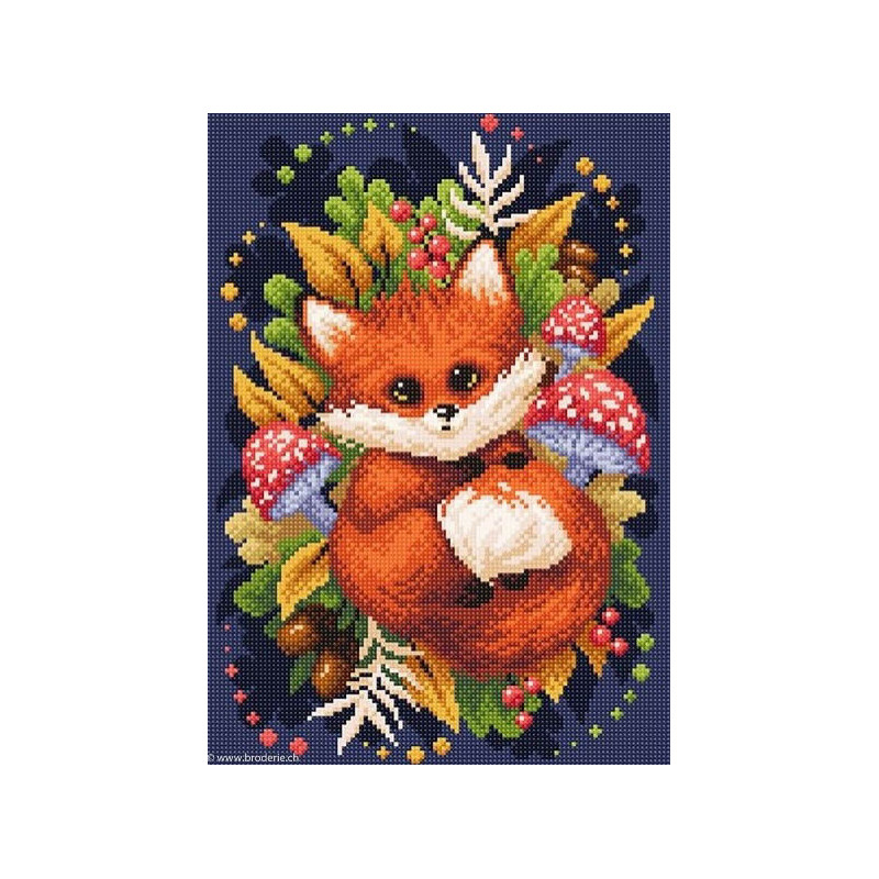 BrilliArt, kit diamant Autumn fox (art. MC-065). Dimensions: 27 x 38 cm. Kit comprenant la toile adhésive, les strass carrés emballés dans des sachets individuels et numérotés aux références des coloris de DMC, une pince, un stylo et sa colle, 2 réceptables et les explications.Toute la surface du tableau est à recouvrir de strass. ATTENTION: ce n'est pas une broderie, il n'y a ni fil ni aiguille, mais un collage comme une mosaïque.