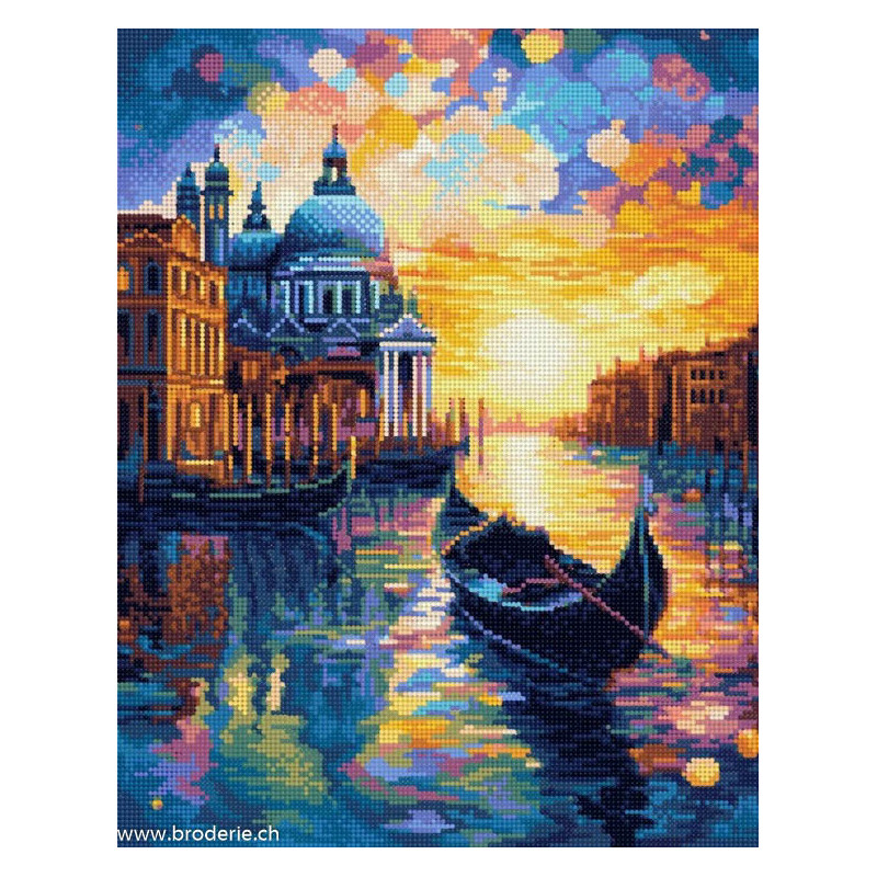 ArtCity, kit diamant Venice at sunset (art. ACVA820). Dimensions: 30 x 40 cm. Kit Diamant comprenant la toile adhésive imprimée à recouvrir de strass, les sachets de strass 'diamants' ronds triés par couleurs, un stylet et sa cire, un réceptacle et les explications.La toile est déjà tendue sur cadre et est entièrement à recouvrir de strass.ATTENTION, ce n'est pas une broderie, pas de fil ni d'aiguille, mais une mosaïque.
