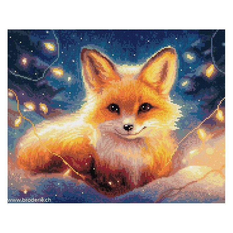 ArtCity, kit diamant Fox in the lights (art. ACVA827). Dimensions: 40 x 30 cm. Kit Diamant comprenant la toile adhésive imprimée à recouvrir de strass, les sachets de strass 'diamants' ronds triés par couleurs, un stylet et sa cire, un réceptacle et les explications.La toile est déjà tendue sur cadre et est entièrement à recouvrir de strass.ATTENTION, ce n'est pas une broderie, pas de fil ni d'aiguille, mais une mosaïque.