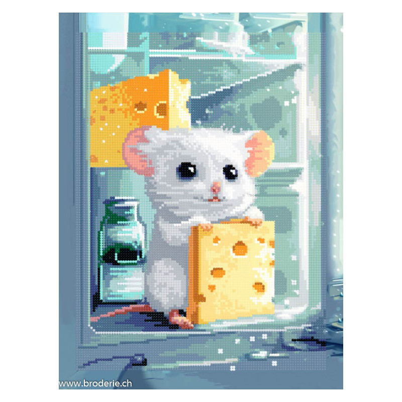 ArtCity, kit diamant Mouse with cheese (art. ACVA830). Dimensions: 30 x 40 cm. Kit Diamant comprenant la toile adhésive imprimée à recouvrir de strass, les sachets de strass 'diamants' ronds triés par couleurs, un stylet et sa cire, un réceptacle et les explications.La toile est déjà tendue sur cadre et est entièrement à recouvrir de strass.ATTENTION, ce n'est pas une broderie, pas de fil ni d'aiguille, mais une mosaïque.
