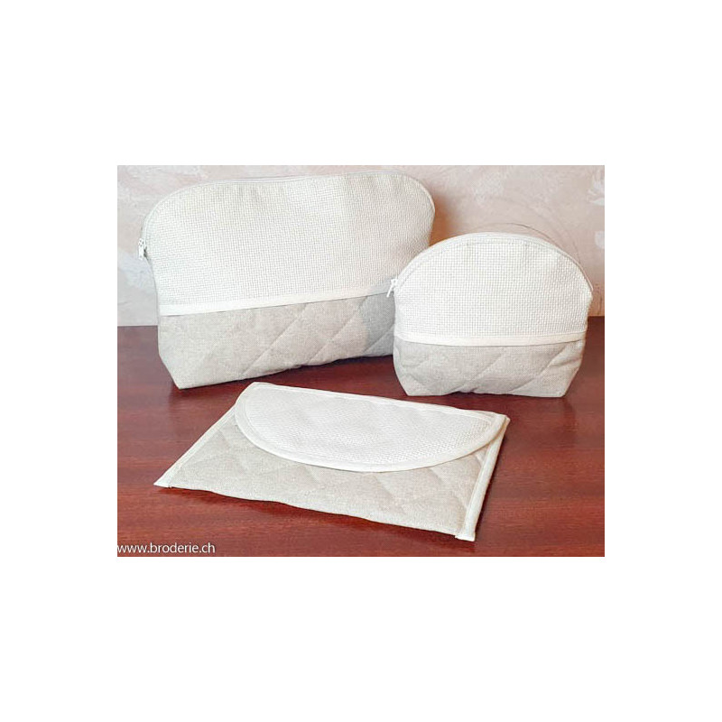 Ricami, Petite pochette avec soufflet écru (art. BA00215.23). Dimensions: 15 x 13 cm. En haut sur la photo à droite. Pochettte avec une bande à broder 5.5 points/cm d'environ 34 points de haut max au milieu, dans la même série BA00215.13 et BA00215.03.