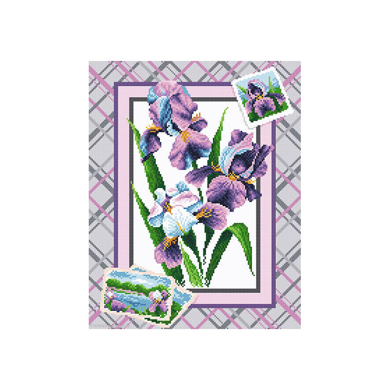 BrilliArt, kit diamant Iris bunch (art. MC-040). Dimensions: 38 x 48 cm. Kit comprenant la toile adhésive, les strass carrés emballés dans des sachets individuels et numérotés aux références des coloris de DMC, une pince, un stylo et sa colle, 2 réceptables et les explications.Toute la surface du tableau est à recouvrir de strass. ATTENTION: ce n'est pas une broderie, il n'y a ni fil ni aiguille, mais un collage comme une mosaïque.