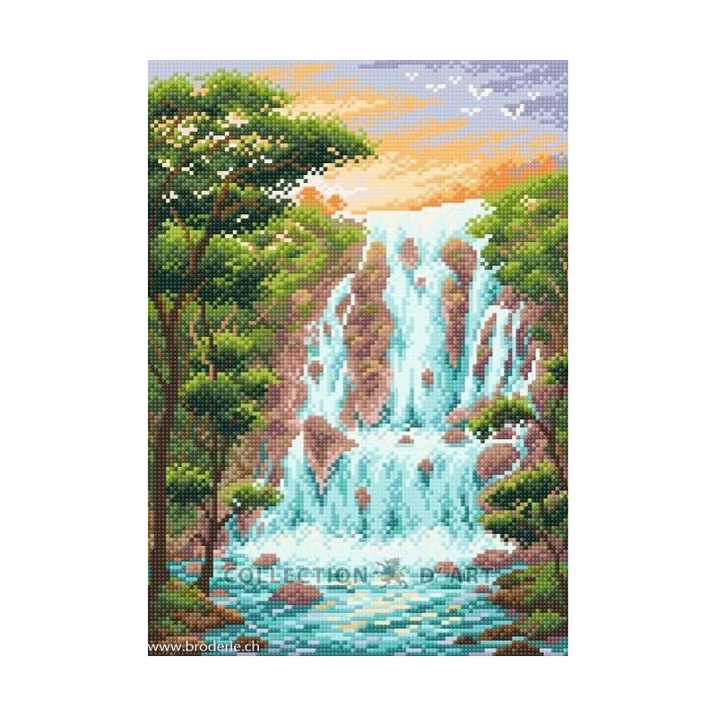 BrilliArt, kit diamant Waterfall (art. MC-083). Dimensions: 27 x 38 cm. Kit comprenant la toile adhésive, les strass carrés emballés dans des sachets individuels et numérotés aux références des coloris de DMC, une pince, un stylo et sa colle, 2 réceptables et les explications.Toute la surface du tableau est à recouvrir de strass. ATTENTION: ce n'est pas une broderie, il n'y a ni fil ni aiguille, mais un collage comme une mosaïque.