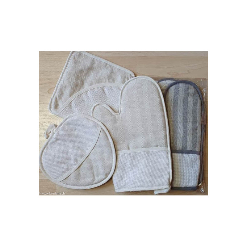 Ricami, trio de maniques damassé cadrillé écru (art. CU00631.015). Set de trois pièces: un gant de cuisine et deux maniques, tous avec une surface aïda 5.5 points/cm à broder. Dans cette même gamme d'articles de cuisine, références CU00631. ...90% coton 10% polyester, à gauche sur la photo.