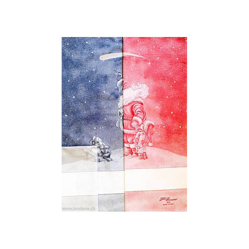 Graziano, Linge de cuisine Père-Noël, rouge (art. CU6213). Dimensions: 60 x 75 cm. Linge de cuisine, 100% coton, avec une bande à broder 5.5 points/cm de 46 points de haut et 42.5 cm de large. Avec l'étoile filante avec un fil doré, à droite sur la photo, dmc correspondant rouge.