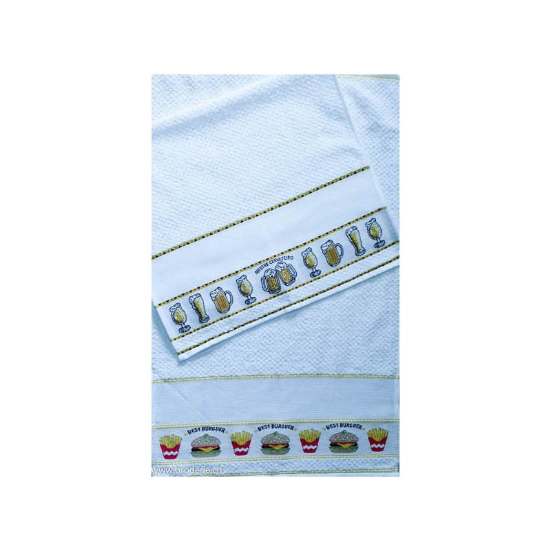 Ricami, Linge éponge blanc avec bordure Bières (art. CU00385BIE). Dimensions: 45 x 70 cm. Linge éponge 100% coton, avec une bande à broder aïda 7 points/cm de 40 points de haut, dessus sur la photo.