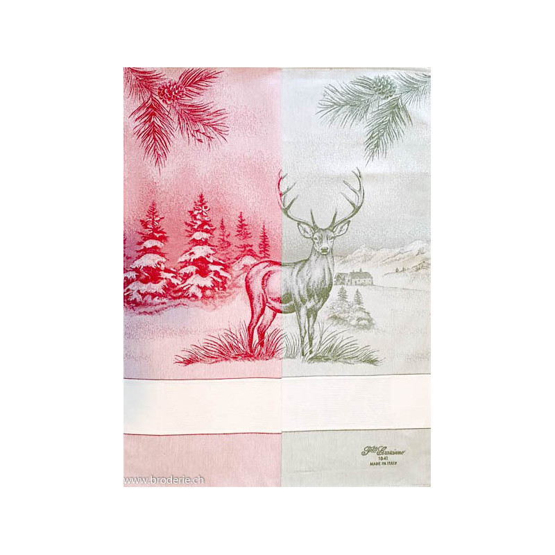 Graziano, Linge de cuisine Cerf dans la forêt, rouge-rosé (art. CU6401). Dimensions: 60 x 75 cm. Linge 100% coton, avec une bande 5.5 points/cm de 45 points, à gauche sur la photo. Coton DMC correspondant.