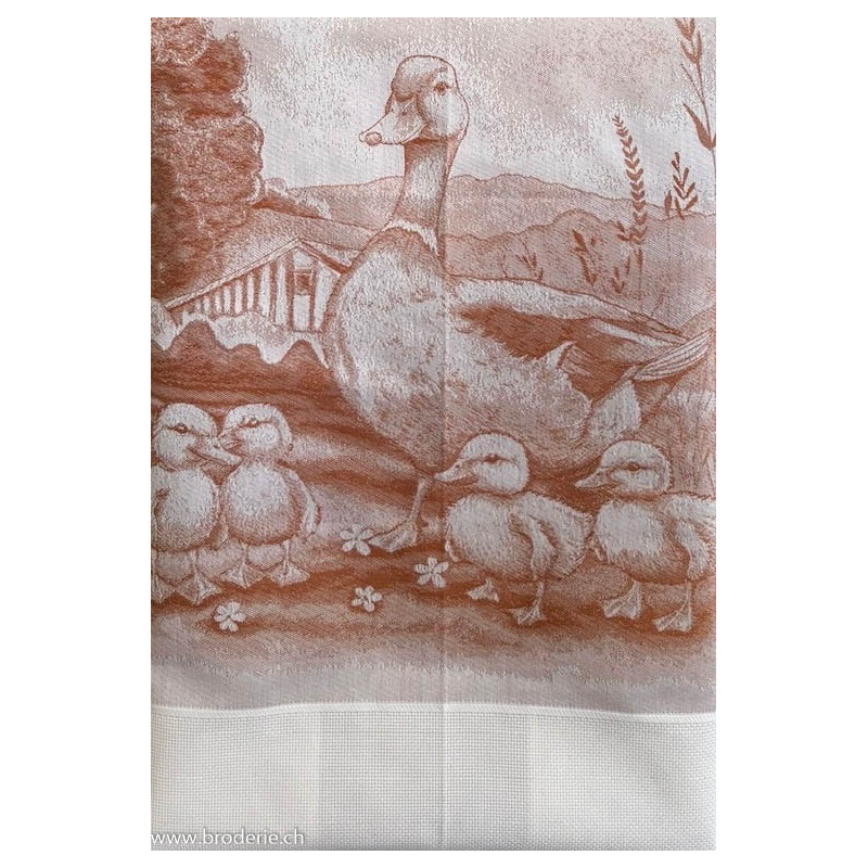 Graziano, Linge de cuisine Rovigo Canard moutarde (art. CU6600). Dimensions: 60 x 75 cm. Linge mi-coton-mi-lin, fond écru, avec une bande à broder 5.5 points/cm de 50 point de haut, largeur 42cm,La photo resort mal avec les couleurs, c'est jaune-moutarde.Référence mouliné DMC 780.