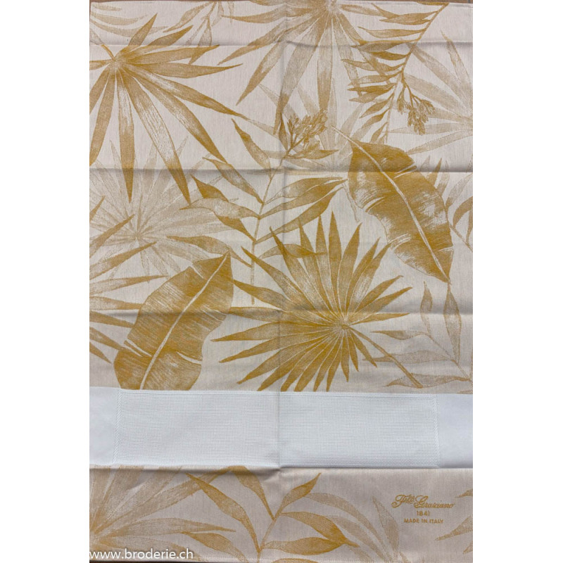Graziano, Linge de cuisine Belize Feuilles jaune moutarde (art. CU6581). Linge mi-coton-mi-lin, fond écru, avec une bande à broder 5.5 points/cm de 50 point de haut, largeur 42cm,Référence mouliné DMC 728.