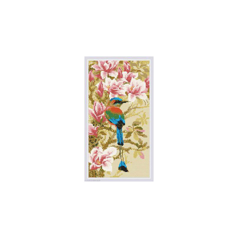 Riolis, kit diamant Bird (art. RIAM0046). Dimensions: 20 x 38 cm. Contenu: toile adhésive comportant le diagramme à recouvrir de strass, sachets de strass carrés numérotés aux références DMC de 2.5 x 2.5mm, pince pour positionner les strass.Toute la surface est à recouvrir.ATTENTION: pas de fil ni d'aiguille, c'est du collage.