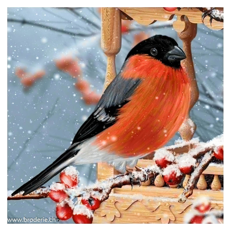 Wizardi, kit diamant Bullfinch (art. WIWD3044). Dimensions: 20 x 20 cm. Kit complet de Broderie Diamant comprenant la toile adhésive imprimée à recouvrir de strass, les sachets de strass 'diamants' triés par couleurs, un stylet et sa cire, un réceptacle et les explications. La totalité de la surface est à recouvrir. ATTENTION, ce n'est pas une broderie, pas de fil ni d'aiguille, mais une mosaïque.