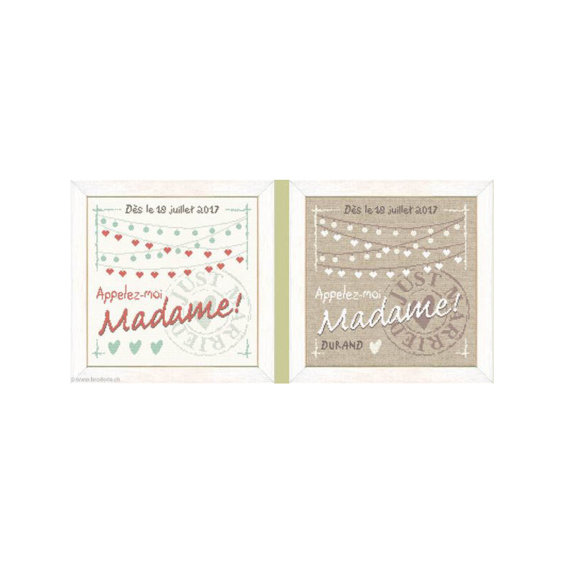 L'article 'LiliPoints, Grille Appelez-moi Madame (M016)' fait partie de notre assortiment depuis le 15 mars 2017. LiliPoints nous propose une très jolie gamme moderne de points de croix comptés, faciles à réaliser sur des thèmes toujours actuels - mariages- naissance - fêtes - Noël. Détail important: la créatrice nous conseille souvent dans ces fiches de réaliser la broderie 1 fil sur 1 fil lorsque les modèles ont plus de 150 points de large ou de haut. A vous de choisir ainsi la taille du résultat car en utilisant la trame standard 5.5 points/cm, les broderies sont parfois un peu grandes pour les monter en cadre, et alors nous conseillons de les monter sur un coussin (lorsqu'ils s'agit notamment de broderie à thème - amitié - mariage). Fiche technique : points de croix - peu de teintes utilisées dans les cotons - peu de points arrières. Les accessoires proposés sont souvent compris avec la fiche (coeurs en nacre - boutons).