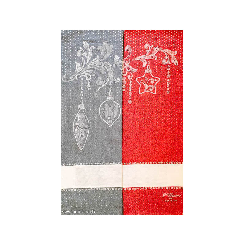Graziano, Linge de cuisine Noël boules, bleu-gris (art. CU6256). Dimensions: 55 x 75 cm. Linge de cuisine 100 % coton, avec une bande à broder blanche 5.5 points/cm de 40 points de haut et 39 cm de large, à gauche sur la photo. Dmc correspondant bleu-gris.