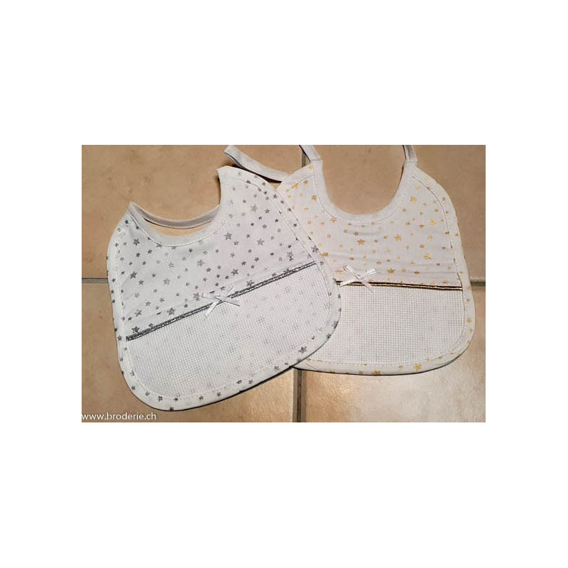Ricami, petit bavoir Noël avec étoiles et lurex doré (art. NA00224.40). Petit bavoir de 17cm sur 17 environ avec une bande à broder 5.5 pointscm blanche de 33 points de haut, à droite sur la photo.