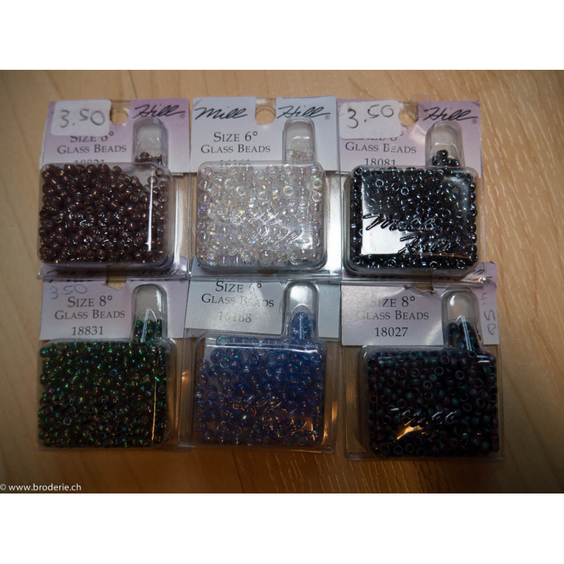 Mill Hill, Glass Glass Beads Size 6 or 8 (art. MHGB6-8). Numéros dans les 160000 et 18000. Grandes perles de rocailles vendues en boîte, de 6 grammes environ, la contenance en quantité peut changer d'une boîte à l'autre, utilisées surtout dans les broderies Mirabaila, Mill Hill et autres gammes américaines, merci de noter le numéro désiré dans la rubrique remarque lors de votre commande.