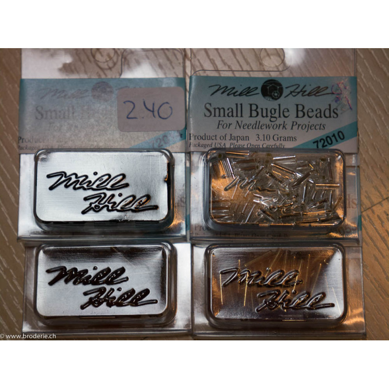Mill Hill, Small and medium Bugle Beads (art. MHSBB). Numéros dans les 70000 pour les petites et 80000 pour les moyennes. Perles allongées, 1cm environ, la contenance en quantité peut changer d'une boîte à l'autre, utilisées surtout dans les broderies Mirabaila, Mill Hill et autres gammes américaines, merci de noter le numéro désiré dans la rubrique remarque lors de votre commande.