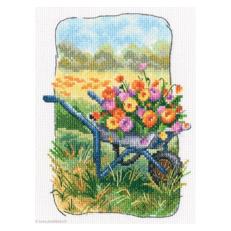L'article 'RTO, kit Grandmother's old garden - brouette et fleurs (RTOC347)' fait partie de notre assortiment depuis le 28 janvier 2022. Voilà une sympathique gamme de points de croix comptés, tous livrés en kit aur aïda. RTO nous vient d'Estonie et propose de ravissants kits sur pleins de sujets différents, allant des fleurs, aux animuax et tableaux rétro des années 60, et aussi bien des motifs rigolos avec des animaux. Lorsque un modèle comprends des "frères" du même style, les références sont notées dans le détail. Vous trouverez aussi plein de petits kits à 6.- et moins, idéeaux pour commencer le point de croix ... ou pour simplement avoir le motif et les cotons pour un modèle à broder sur autre support: pour cette recherche, mettez "RTO, petit kit " et vous les voyez rapidement. RTO propose ses kits avec le cotons mouliné DMC art 117. Explication dans les kits en russe et en anglais.