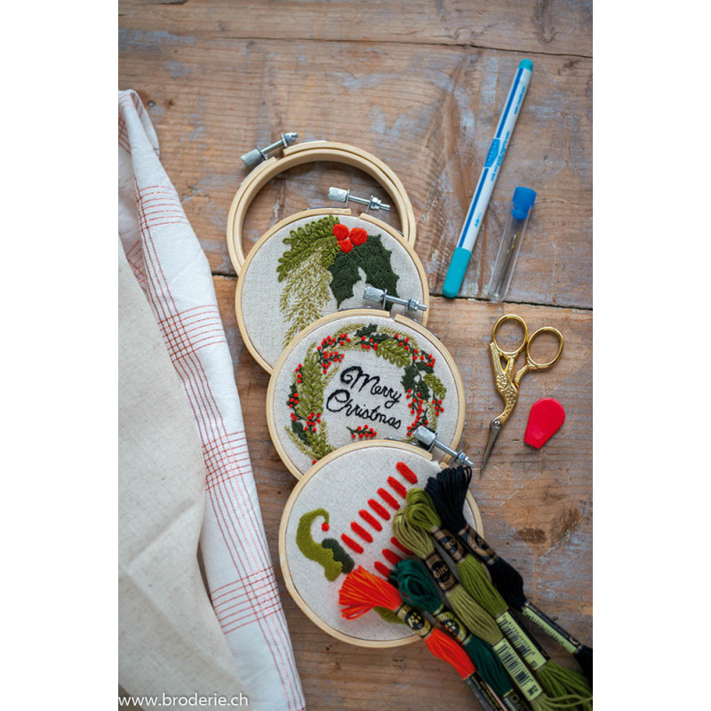 Vervaco, kit imprimé Daffy's Noël (art. PN-0198862). Dimensions: 0 x 0 cm. Matériel contenu dans ce coffret : 3 tambours de 10cm de diamètre, une pice de tissu de 25cm sur 25, jeu d'aiguille et coupe-fil, stylo soluble dans l'eau, 5 écheveaux de fils dans les bonnes teintes, et instructions en ligne avec code QR, dessin et explication de tous les points.