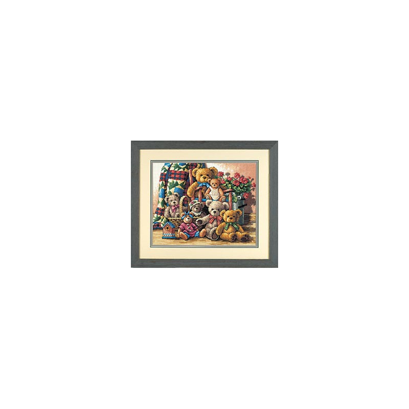 Dimensions Gold, kit Teddy Bear Gathering (art. DIM35115). Dimensions: 38 x 30 cm. Points utilisés: point de croix, demi-point, point de piqûre. Broderie sur aïda, relativement complexe et remplie, avec l'utilisation de 2 à 5 brins pour les points, et parfois un mélange de fils de différentes couleur pour un point, ce qui donne un bel aspect de profondeur de l'image.