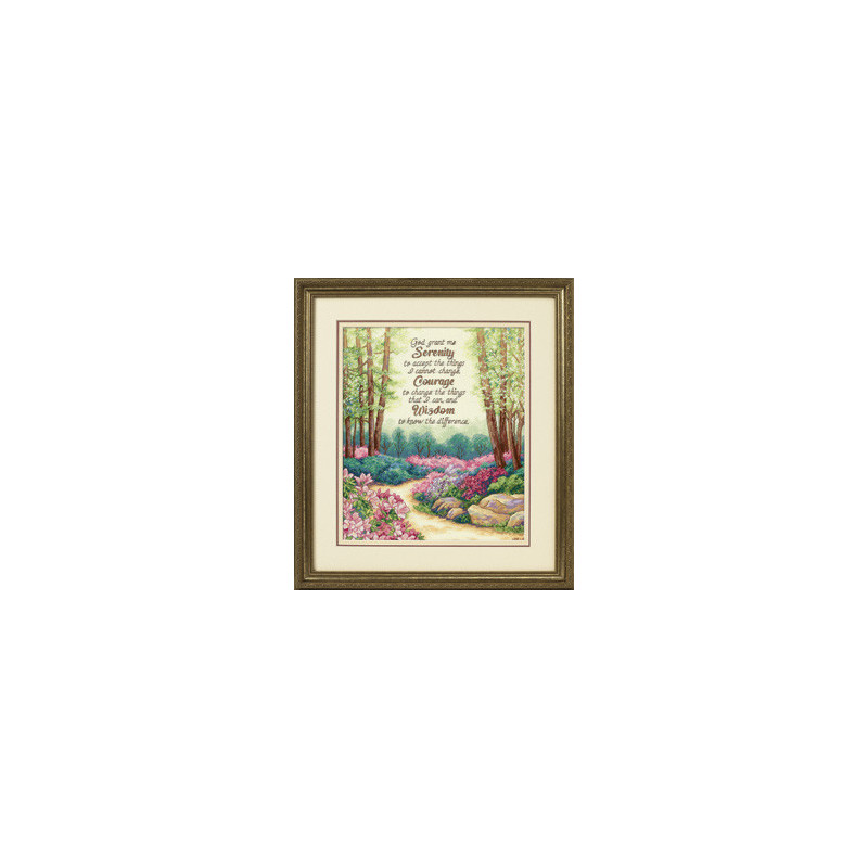Dimensions Gold, kit Serenity, Courage, & Wisdom (art. DIM35162). Dimensions: 30 x 36 cm. Points utilisés: point de croix, demi-point, point de piqûre. Broderie sur aïda6.4 points/cm écru, relativement complexe et remplie, avec l'utilisation de 2 à 5 brins pour les points, et parfois un mélange de fils de différentes couleur pour un point, ce qui donne un bel aspect de profondeur de l'image.
