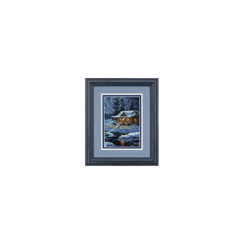 Dimensions Gold, kit Moonlit Cabin (art. DIM65007). Dimensions: 13 x 18 cm. Points utilisés: point de croix, demi-point, point de piqûre. Broderie sur aïda bleu marin 7 points/cm, relativement complexe et remplie, avec l'utilisation de 2 à 5 brins pour les points, et parfois un mélange de fils de différentes couleur pour un point, ce qui donne un bel aspect de profondeur de l'image.