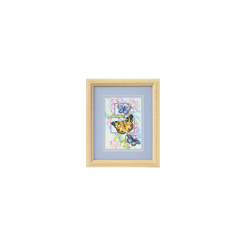 Dimensions Gold, kit Blossoms and Butterflies (art. DIM65022). Dimensions: 13 x 18 cm. Trame: Aïda 5.5 pts. Points utilisés: point de croix, demi-point. Broderie sur aïda vert tendre, relativement complexe et remplie, avec l'utilisation de 2 à 5 brins pour les points, et parfois un mélange de fils de différentes couleur pour un point, ce qui donne un bel aspect de profondeur de l'image.