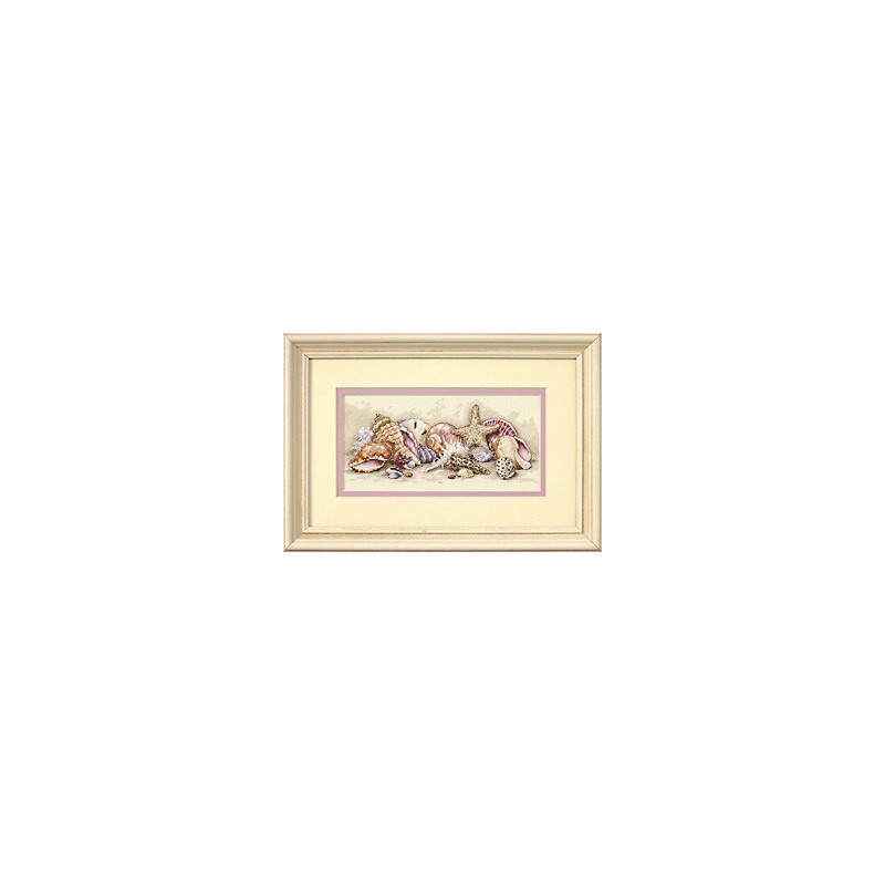 Dimensions Gold, kit Seashell treasures (art. DIM65035). Dimensions: 20 x 10 cm. Points utilisés: point de croix, demi-point, point de piqûre. Broderie sur aïda, relativement complexe et remplie, avec l'utilisation de 2 à 5 brins pour les points, et parfois un mélange de fils de différentes couleur pour un point, ce qui donne un bel aspect de profondeur de l'image.