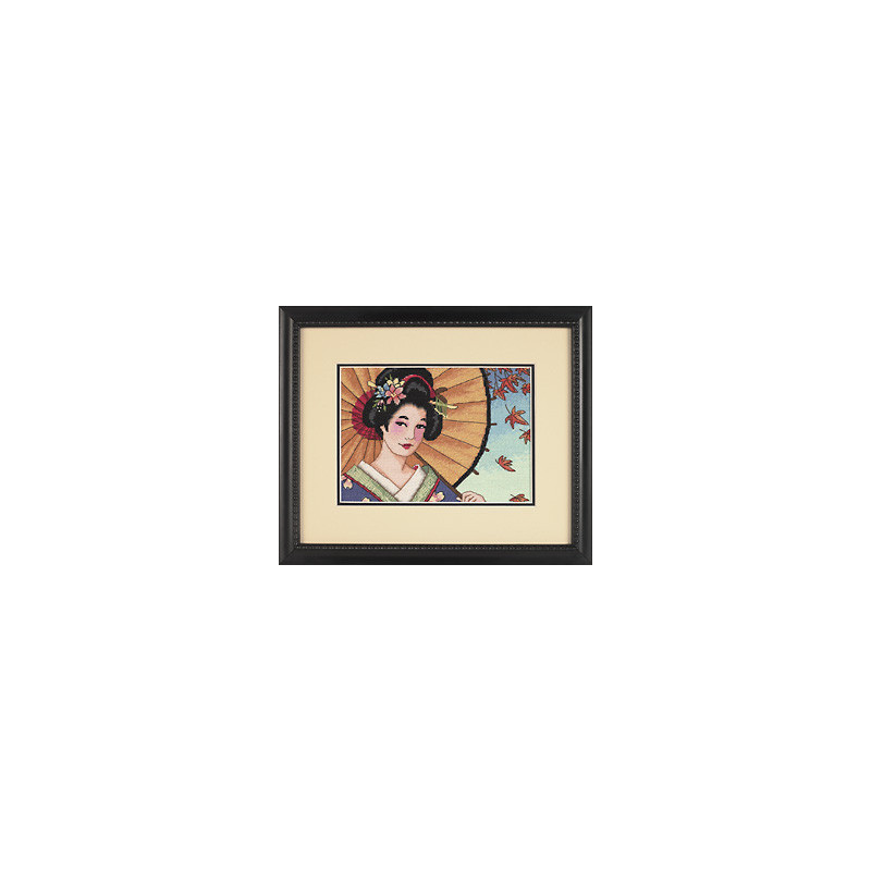 Dimensions Gold, kit Geisha beauty (art. DIM65036). Dimensions: 18 x 13 cm. Points utilisés: point de croix, demi-point, point de piqûre. Broderie sur aïda, relativement complexe et remplie, avec l'utilisation de 2 à 5 brins pour les points, et parfois un mélange de fils de différentes couleur pour un point, ce qui donne un bel aspect de profondeur de l'image.