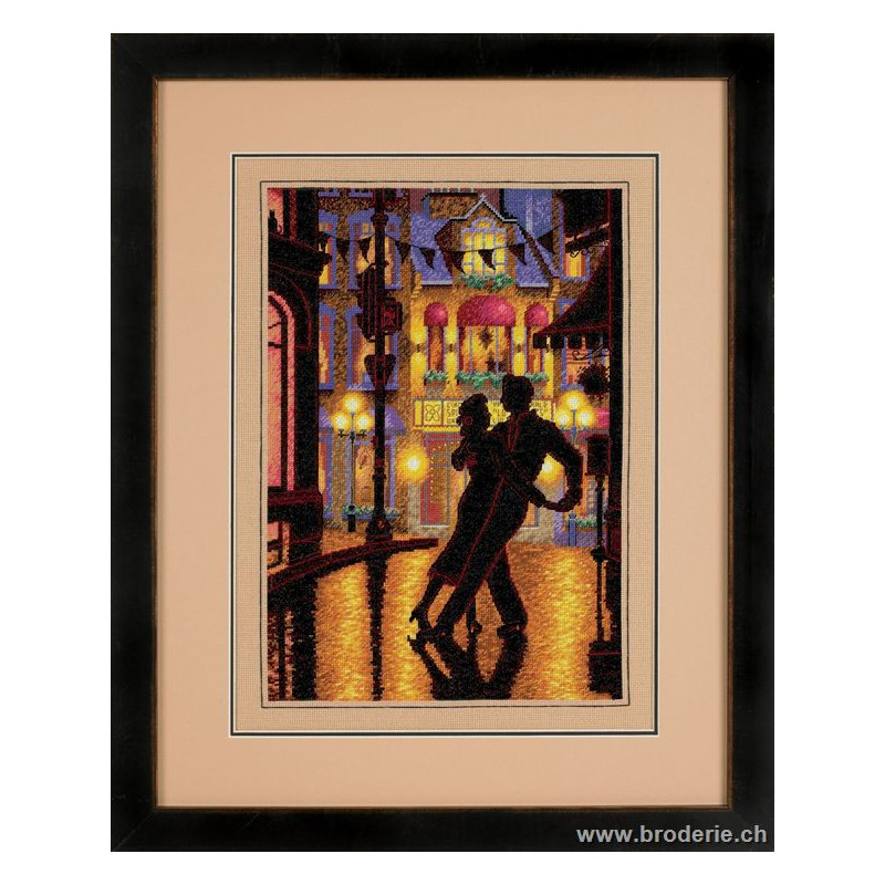 Dimensions Gold, kit Midnight Dance (art. DIM35248). Dimensions: 28 x 38 cm. Points utilisés: point de croix, point de piqûre. Broderie sur aïda 7 points/cm beige, relativement complexe et remplie, avec l'utilisation de 2 à 5 brins pour les points, et parfois un mélange de fils de différentes couleur pour un point, ce qui donne un bel aspect de profondeur de l'image...