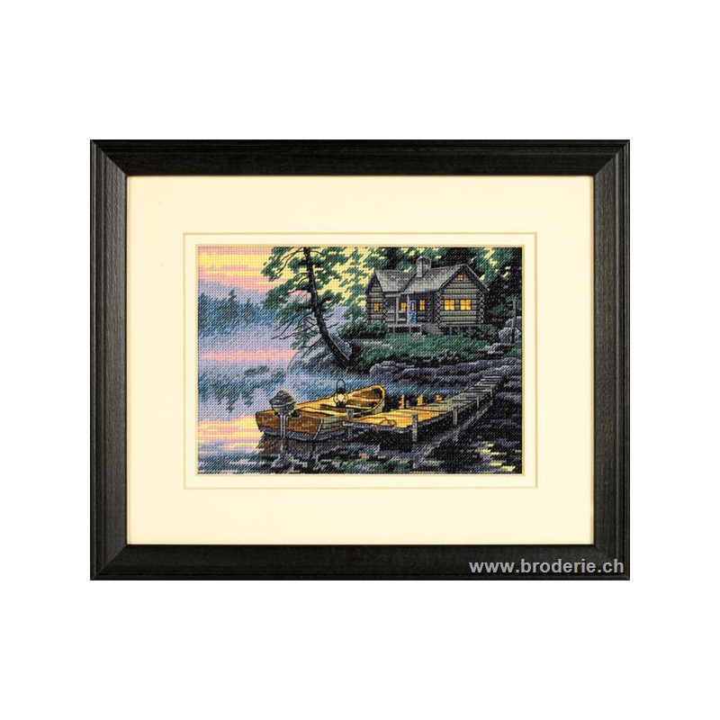 Dimensions Gold, kit Morning Lake (art. DIM65091). Dimensions: 18 x 13 cm. Points utilisés: point de croix, point de piqûre. Broderie sur aïda 7 points/cm, relativement complexe et remplie, avec l'utilisation de 2 à 5 brins pour les points, et parfois un mélange de fils de différentes couleur pour un point, ce qui donne un bel aspect de profondeur de l'image.