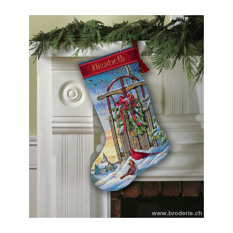 Dimensions Gold, kit Christmas Sled Stocking (art. DIM08819). Points utilisés: demi-point, point de piqûre. Broderie sur aïda, relativement complexe et remplie, avec l'utilisation de 2 à 5 brins pour les points, et parfois un mélange de fils de différentes couleur pour un point, ce qui donne un bel aspect de profondeur de l'image.