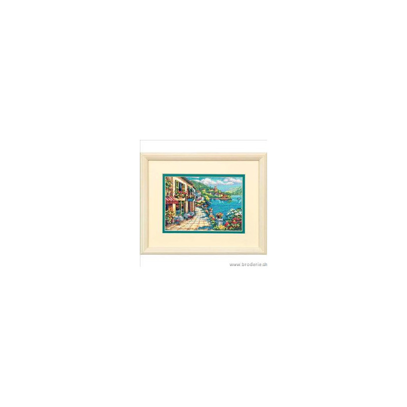 Dimensions Gold, kit Overlook Café (art. DIM65093). Dimensions: 18 x 13 cm. Points utilisés: point de croix, point de piqûre. Broderie sur aïda, relativement complexe et remplie, avec l'utilisation de 2 à 5 brins pour les points, et parfois un mélange de fils de différentes couleur pour un point, ce qui donne un bel aspect de profondeur de l'image.