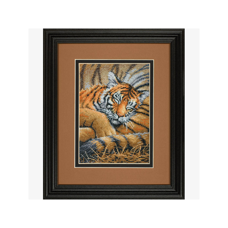 Dimensions Gold, kit Cozy Cub (art. DIM65105). Dimensions: 13 x 18 cm. Broderie sur aïda 7 points/cm écru, relativement complexe et remplie, avec l'utilisation de 2 à 5 brins pour les points, et parfois un mélange de fils de différentes couleur pour un point, ce qui donne un bel aspect de profondeur de l'image.