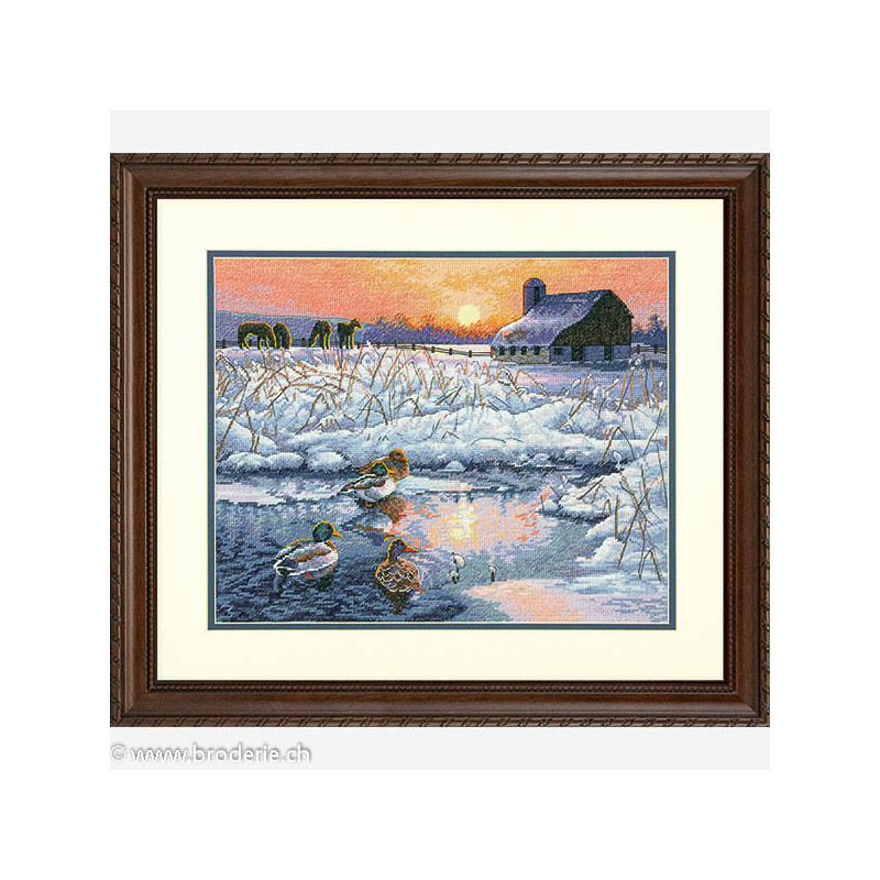 Dimensions, kit Winter Morning (art. DIM35304). Dimensions: 30 x 37.5 cm. Points utilisés: point de croix. Broderie sur aïda, relativement complexe et remplie, avec l'utilisation de 2 à 5 brins pour les points, et parfois un mélange de fils de différentes couleur pour un point, ce qui donne un bel aspect de profondeur de l'image.