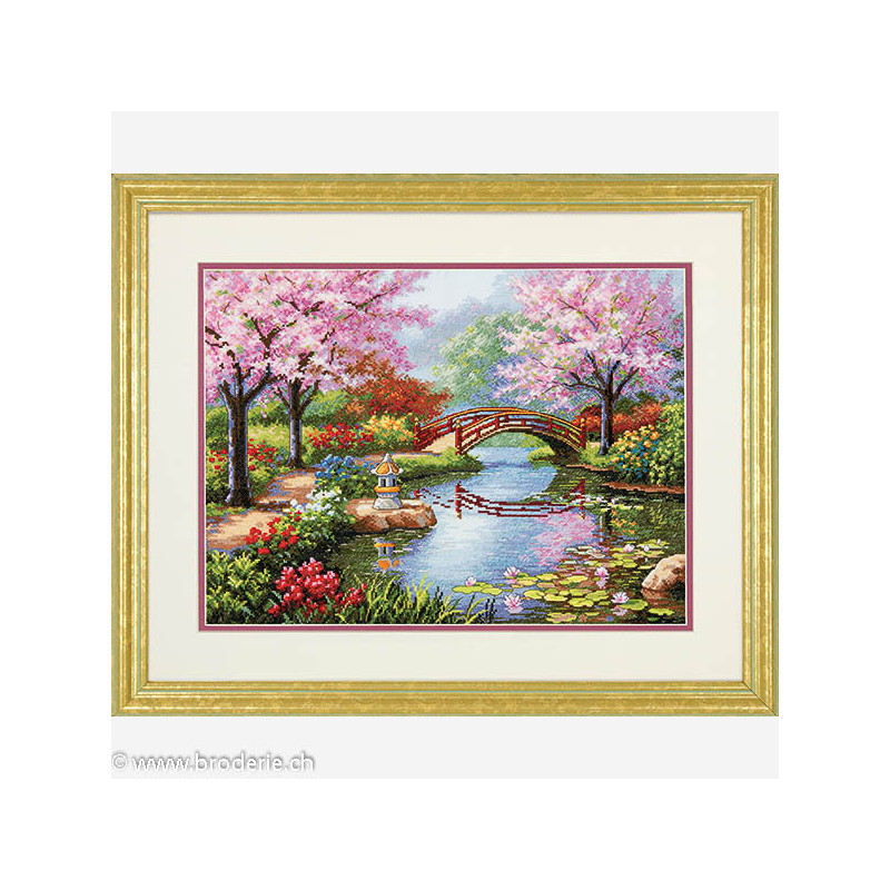 Dimensions Gold, kit le Jardin japonais (art. DIM35313). Dimensions: 40 x 30 cm. Broderie sur aïda 6.4 points/cm bleu clair, relativement complexe et remplie, avec l'utilisation de 2 à 5 brins pour les points, et parfois un mélange de fils de différentes couleur pour un point, ce qui donne un bel aspect de profondeur de l'image.